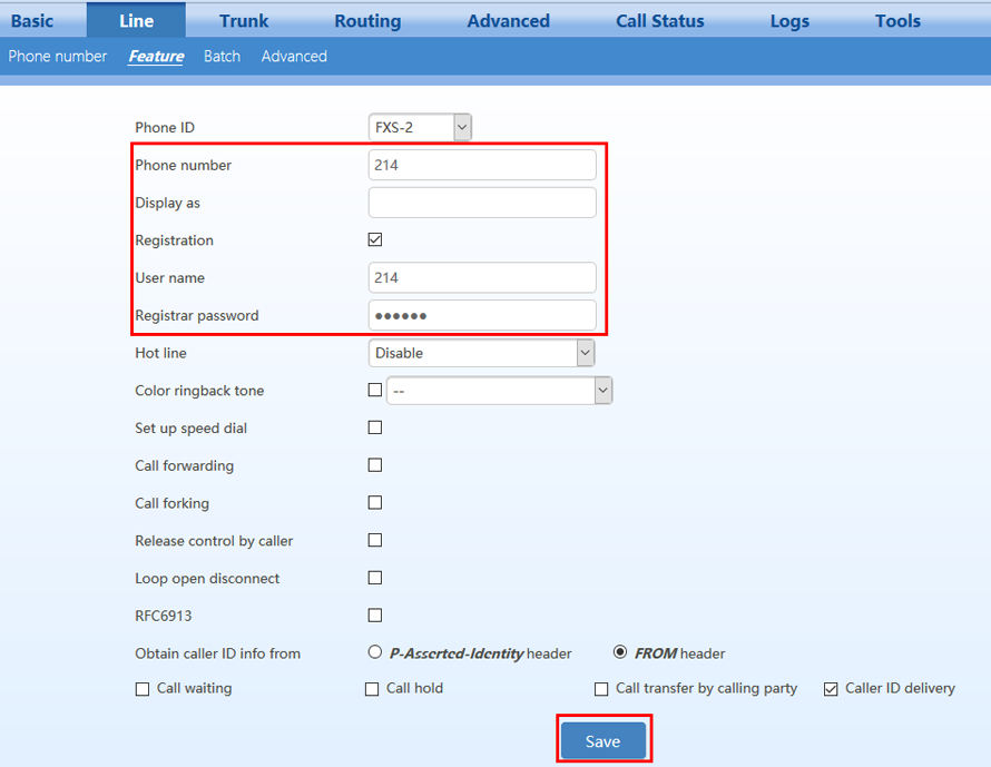 در مسیر Line =>Feature برای هر یک از FXSها شماره و رمز عبوری که در دستگاه OM برای آنها ایجاد کرده بودیم را وارد کنیم و تیک گزینه Registration را نیز میزنیم. برای مثال در شکل زیر به پورت FXS2 شماره داخلی 214 (داخلی آی پی موجود در دستگاه OM) اختصاص دادهشده است.