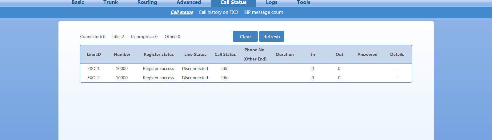 9-اگر موارد بالا را به درستی انجام داده باشید بایستی وضعیت پورت های گیت وی در بخش call status به حالت registered تغییر کرده باشد.